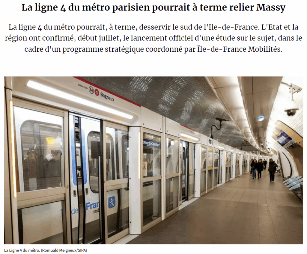 La ligne 4 du métro parisien pourrait à terme relier Massy – Les Echos, publié le 29 août 2025le 30 août 202530 août 2025 Pour lire l'article Cliquez ici Pour lire la version texte de l'article Cliquez ici